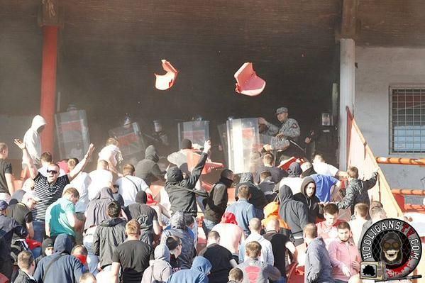 Partida a fost amanata cu 45 de minute, dupa ce fanii Stelei Rosii, gazda de ieri, au aruncat in teren si in fortele de ordine cu scaune, pedarde si torte. Politistii au fost nevoiti sa se retraga, dar au intervenit in forta dupa sosirea intaririlor. Incidentele au continuat si dupa startul partidei, ultrasii celor doua echipe declansand un adevarat bombardament cu petarde si fumigene.