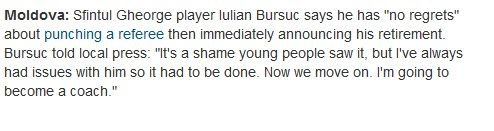 "Nu regret ce am facut. E pacat insa ca tinerii au vazut asta, dar mereu am avut probleme cu acest arbitru si ceva trebuia facut. Acum o sa ma fac antrenor", a spus Bursuc.