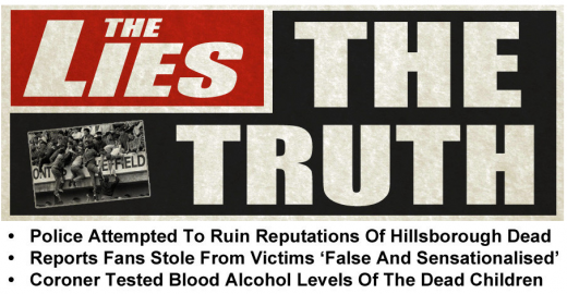 - Campania principalului tabloid, The Sun, in care acestia au acuzat fanii lui Liverpool ca sunt principalii responsabili pentru dezastru. In prima editie de dupa tragedie, acestia i-au acuzat pe fani ca ar fi jefuit victimele si ca i-ar fi batut si ar fi urinat pe politisti. Ancheta din 1990 a demontat toate aceste acuzatii false, iar "The Sun" este boicotat in Liverpool de 23 de ani, oras in care are cele mai proaste vanzari din intreaga Anglie.