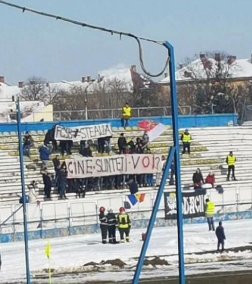 Un grup de suporteri sibieni au afisat un mesaj pe care a stat scris: "FCSB nu e Steaua" si "Cine sunteti voi?".
