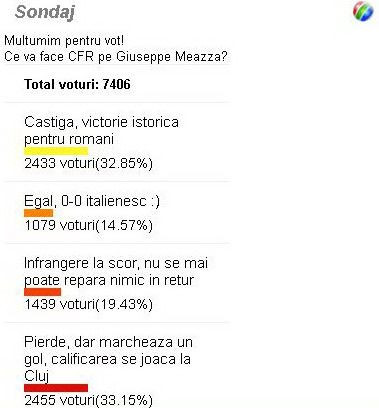 10.05 Intr-un sondaj pe site-ul sport.ro, suporterii sunt convinsi ca CFR nu va pierde calificarea pe Giuseppe Meazza. O infrangere la limita, dar cu gol marcat, sau o victorie istorica la Milano, sunt au fost cele mai votate variante. Iata rezultatele sondajului: