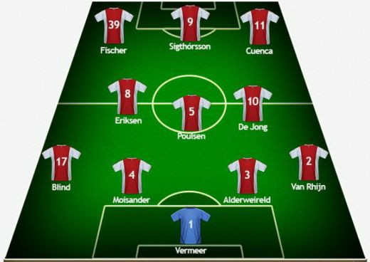 13.52 Olandezii de la ajaxinside.nl au anuntat echipa de start a lui Frank de Boer pentru meciul din aceasta seara. Ajax va juca intr-o formula ultraofensiva, cu 4 oameni de atac. Fischer, Sigthorsson si Cuenca vor forma trio-ul din atac, iar capitanul Siem de Jong, care a fost folosit ca 'varf impins' la ultimele meciuri din campionat, va juca in linia mediana.