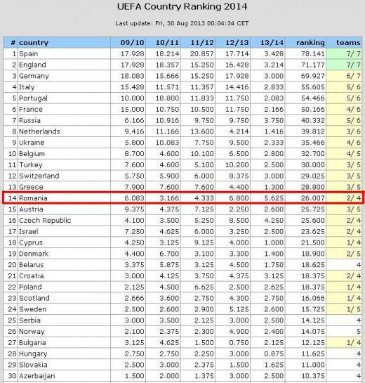 Eliminarea celor de la Legia de catre Steaua ne face misiunea mai usoara in a ne mentine pe locul 14, castigat in fata Austriei in aceasta saptamana. Acestia au avantajul ca au 3 echipe ramase in competitie insa Austria Viena are o grupa criminala in Liga cu Porto, Atletico si Zenit. Obiectivul Romaniei este locul 13, acesta asigurandu-ne o echipa calificata direct in grupele Ligii si una in turul 3! Iar Romania poate spera sa depaseasca Elvetia tocmai la duelul direct dintre Steaua si Basel din grupa E a Ligii Campionilor!