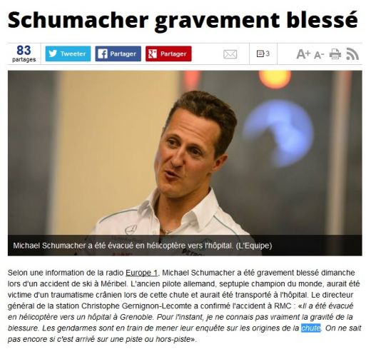 10:20 Surse medicale anunta ca Schumacher a suferit o hemoragie cerebrala dupa ce s-a lovit puternic de o piatra cu capul. In ciuda socului, Schumacher nu si-a pierdut nicio clipa cunostinta pana cand a ajuns la spital. Situatia i s-a inrautatit ulterior.
