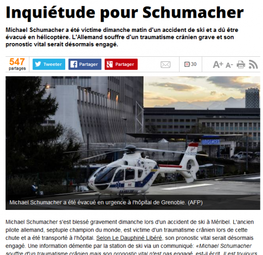 09:27 Ziarul 'Le Dauphiné Libéré' din Grenoble a scris ca ranile lui Schumacher s-au agravat si ca viata ii este pusa in pericol. Un chirurg de top din Paris, Gerard Saillant, cel care l-a operat dupa accidentul de la Silverstone, din 1999, si bun prieten cu Schumi, a venit de urgenta la Grenoble pentru a asista la procedura medicala pe creier la care legenda F1 a fost supusa.