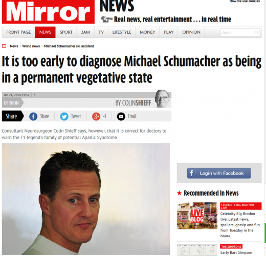"Schumacher ar putea sa ramana in coma pentru totdeauna" au scris acestia. In plus, Bild anunta ca situatia lui Schumacher este un grava incat nu exista planuri pentru scoaterea lui din coma. Riscul cel mare este ca Schumacher sa nu isi mai aduca aminte nimic din viata lui de pana acum: "Daca Schumacher supravietuieste, nu va mai fi Schumacher" a spus Doctorul Richard Greenwood de la University College London Hospital