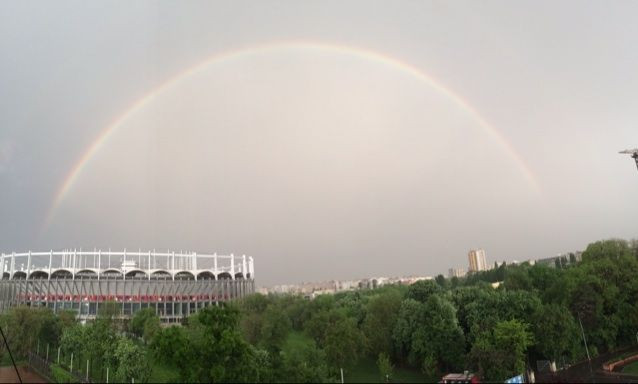 Daca la Chiajna, meciul dintre Viitorul si Universitatea Cluj a fost amanat cu o ora, in Bucuresti a fost surprinsa imaginea zilei langa National Arena. Un utilizator Stirileprotv.ro a fotografiat un curcubeu superb langa Arena Nationala din Capitala.