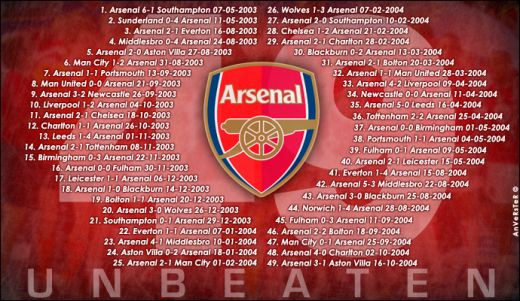 Seria de victorii a tinut din mai 2003 pana in octombrie 2004 si s-a intins pe 3 campionate, reusind sa intreaca recordul lui Nottingham Forest, de 42 de meciuri fara infrangere, si cel al lui Preston North End, singura echipa ce terminase un campionat neinvinsa, insa cu peste 100 de ani inainte de Arsenal.