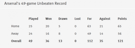 In cele 49 de meciuri, Arsenal a inregistrat doar 13 egaluri, 4 dintre ele cu scorul de 0-0. De altfel, inainte de a face primul egal la zero, cu Fulham, Arsenal reusise sa inscrie in 46 de meciuri consecutive.