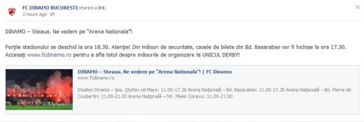"Avand in vedere gradul ridicat de risc stabilit pentru partida de fotbal dintre echipele F.C. DINAMO Bucuresti si F.C. STEAUA Bucuresti, dar si pentru evitarea evenimentelor nedorite atat inainte de inceperea meciului cat si in timpul si dupa terminarea partidei, Jandarmeria Capitalei aduce in atentia suporterilor urmatoarele: