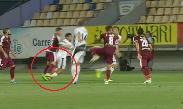 Ultima faza e in minutul 96, chiar inainte de fluierul final, cand Golubovic e tras clar de mana in momentul cand sare sa loveasca mingea cu capul! A treia faza de penalty, Tudor lasa jocul sa curga...