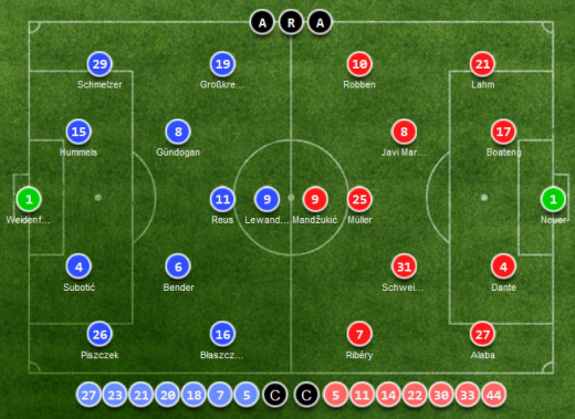 BAYERN: Neuer - Lahm, Boateng, Dante, Alaba - Javi Martinez - Robben, Muller, Schweinsteiger, Ribery - Mandzukic