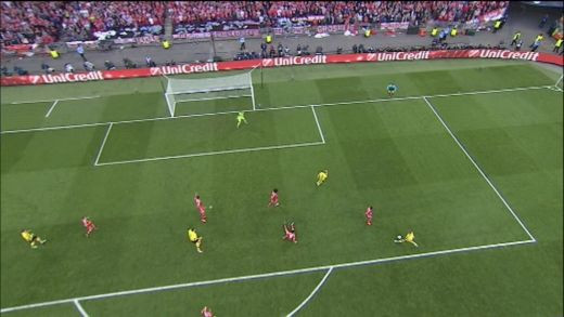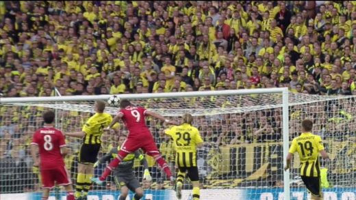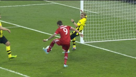 Min 25: Prima actiune ofensiva a lui Bayern este si cea mai mare ocazie de gol de pana acum - Ribery centreaza din partea stanga, Mandzukic reia cu capul din 7 metri, Weidenfeller deviaza cu varful degetelor mingea in transversala.