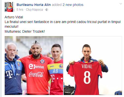 Alin Burileanu, fizioterapeutul echipei nationale, a primit cadou dupa meci tricoul lui Arturo Vidal, vedeta chilienilor.