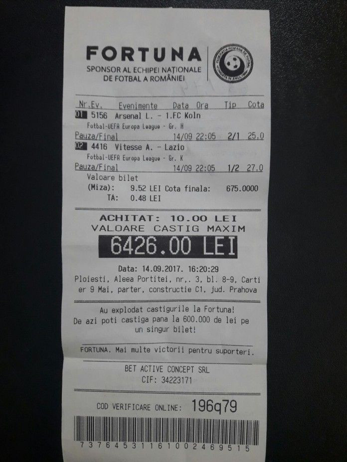 Un parior roman din judetul Prahova a dat lovitura joi, la meciurile din UEFA Europa League. El a mizat 10 lei pe doua pronosticuri si a castigat 6.500 RON.