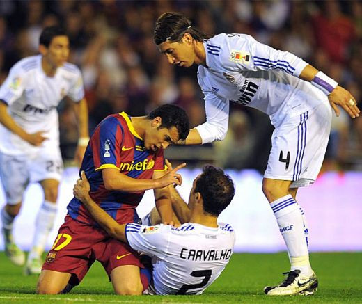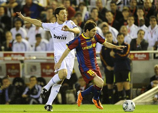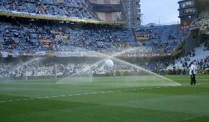 Gazonul de pe Mestalla este udat inaintea meciului, desi Mourinho le-a cerut celor de la stadion sa nu faca asta. Barcelona s-a opus, asa ca organizatorii au decis ca gazonul sa fie udat, pentru un joc mai rapid si mai spectaculos. Pe Bernabeu, la 1-1 in Primera, gazonul nu a fost udat si nici iarba nu a fost taiata, tot la ordinul lui Mourinho, pentru a le "innoda" picioarele lui Messi si Villa. (foto: Marca)