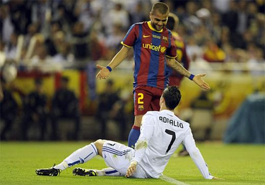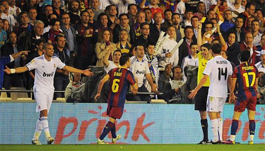 3' Cei de Real au tabarat pe central, caruia ii cer sa ii arate "galben" lui Alves! Abia sunt calmati jucatorii lui Mourinho!