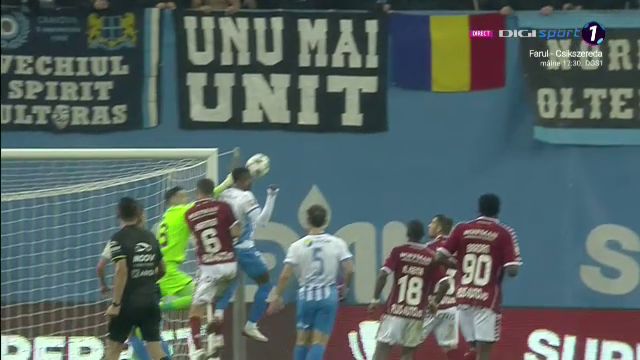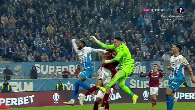 În prelungirile partidei, la scorul de 2-1 pentru Rapid, totul s-a aprins după o fază tensionată în careul bucureștenilor. După o centrare din flanc, Steven Nsimba a sărit la cap, iar portarul Marian Aioani a ieșit violent și l-a lovit din plin pe atacantul francez.