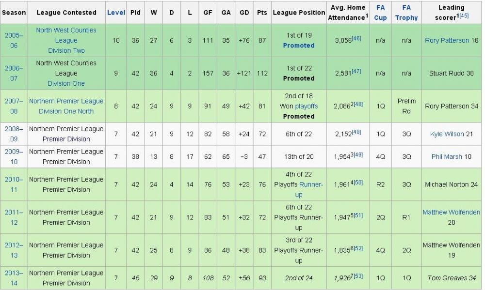 Au urmat inca doi ani cu promovari consecutive, pana in Northern Premier League Premier Division, unde United e si acum. De 4 ani, prinde play-off-ul si rateaza incredibil accesul in Conference North.