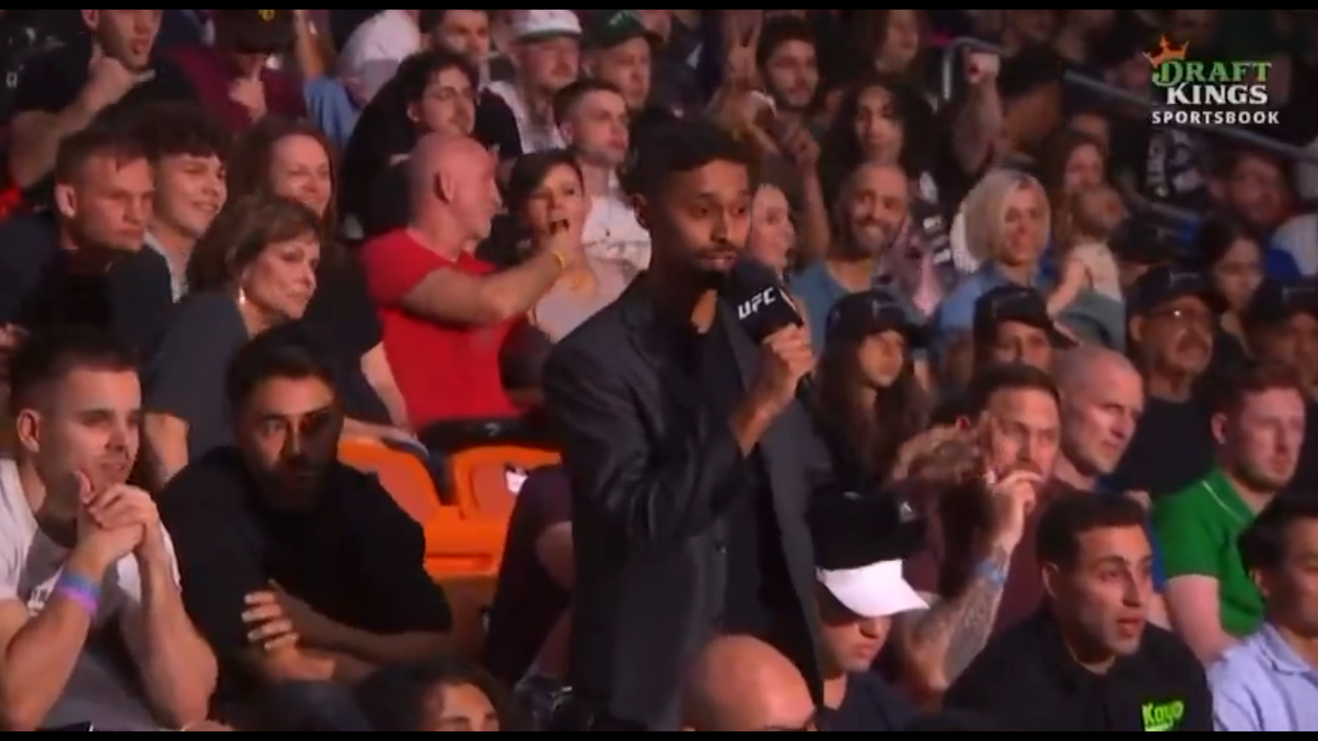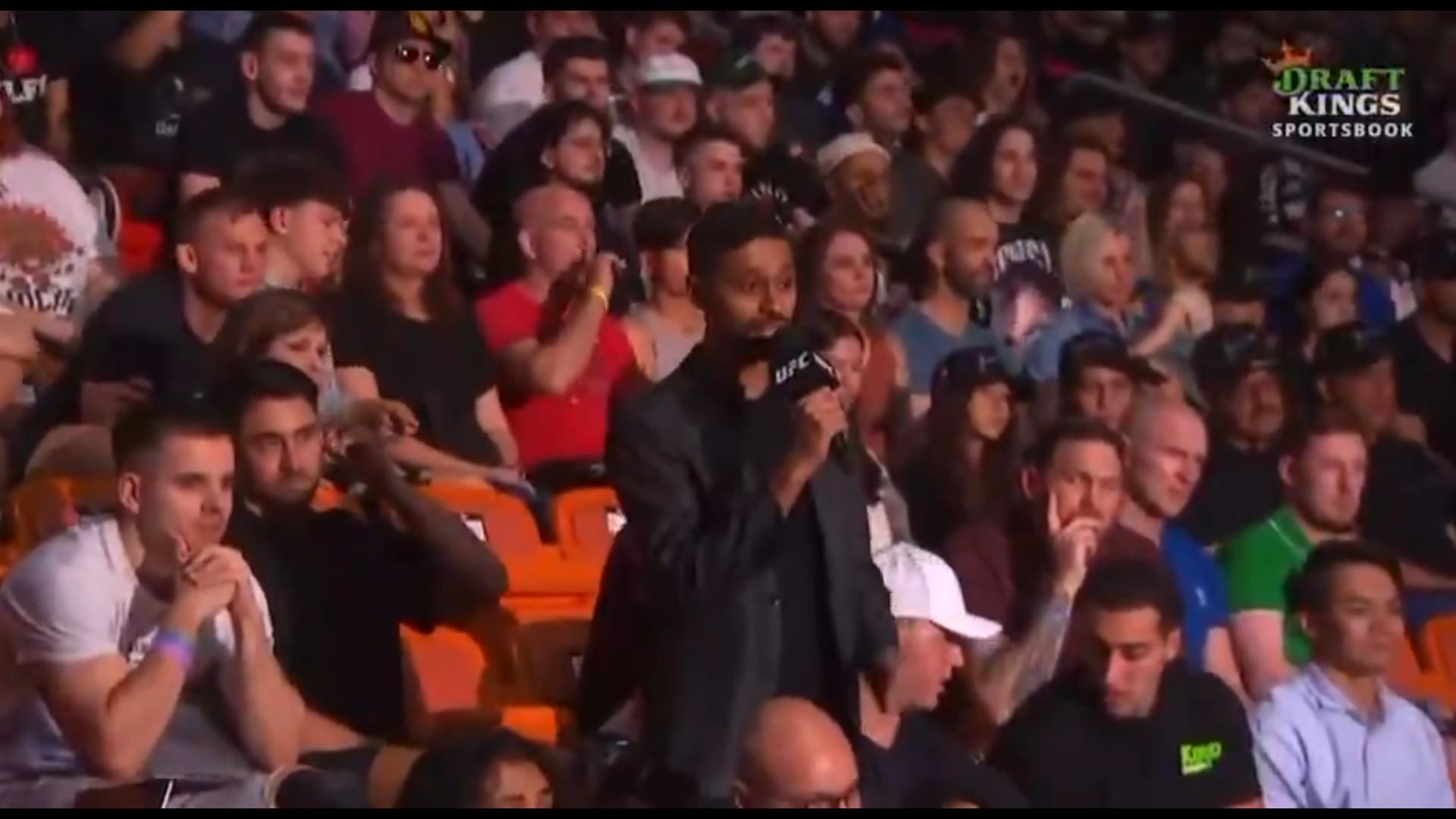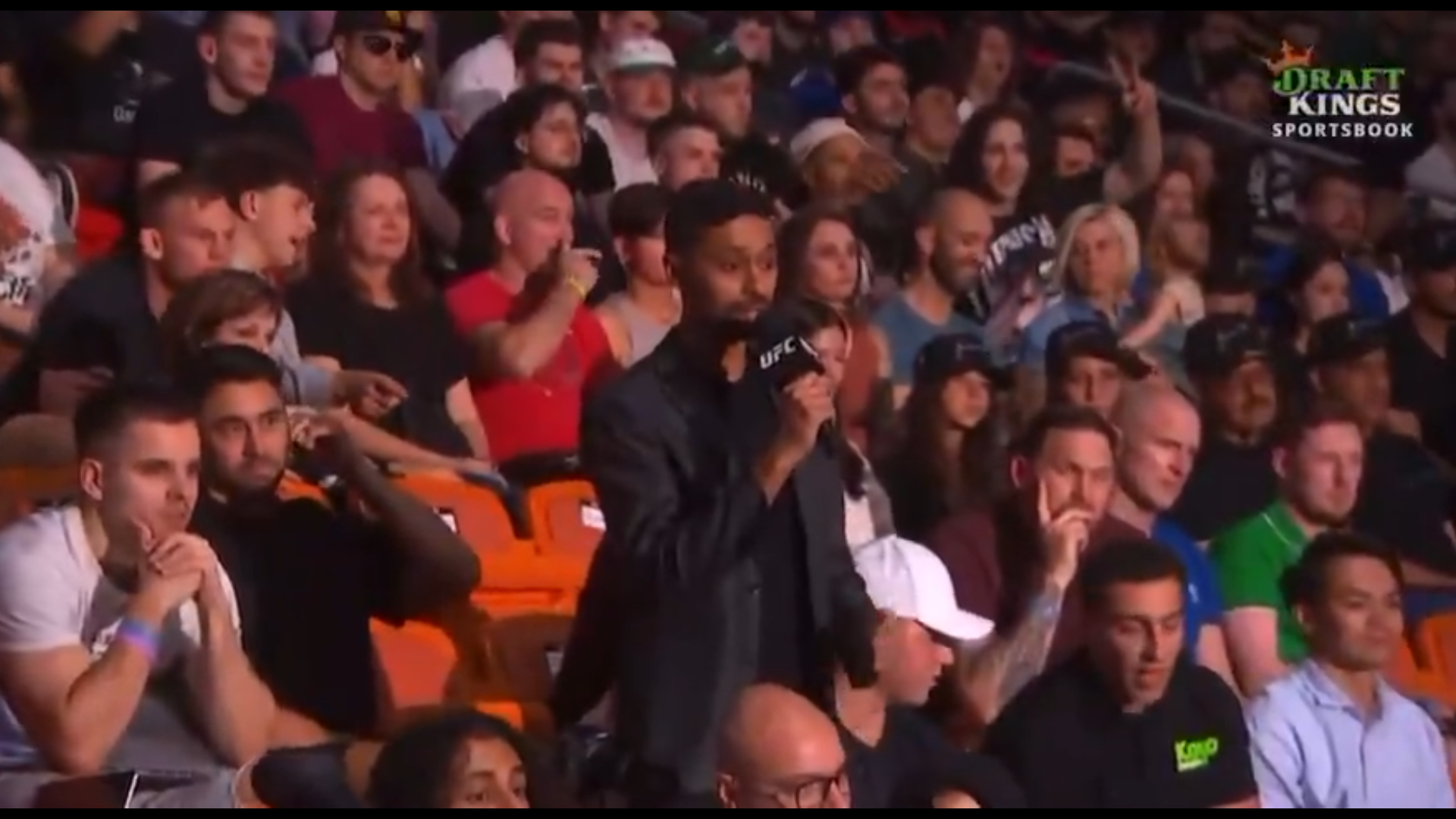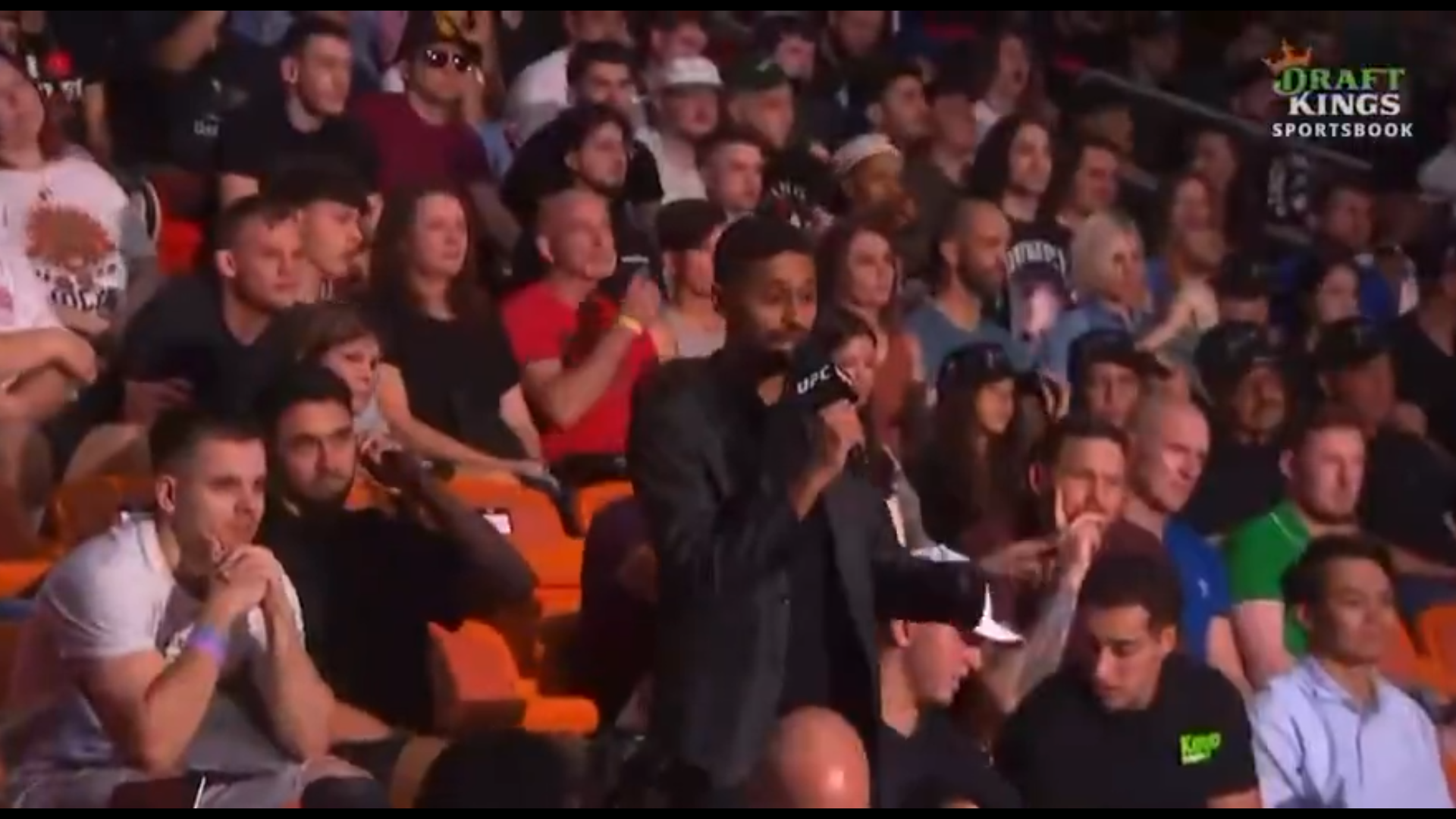 Protagoniști nu au fost însă starurile din UFC. Într-un moment în care pe scenă se aflau Alexander Volkanovski și Diego Lopes, luptătorii care vor asigura main-event-ul galei, într-o luptă pentru centura vacantă de la categoria featherweight, camerele de filmat au surprins un moment revoltător în public.