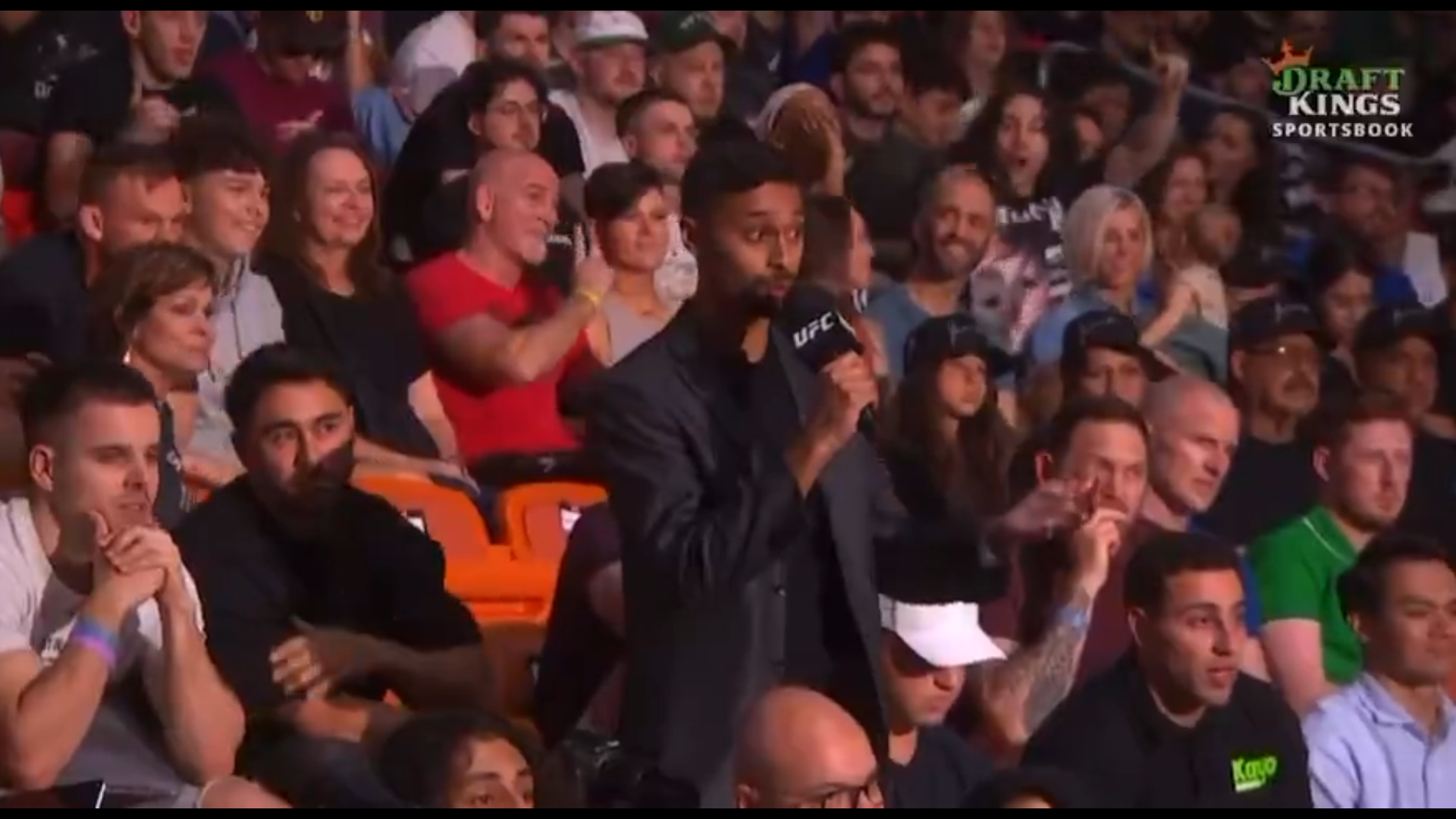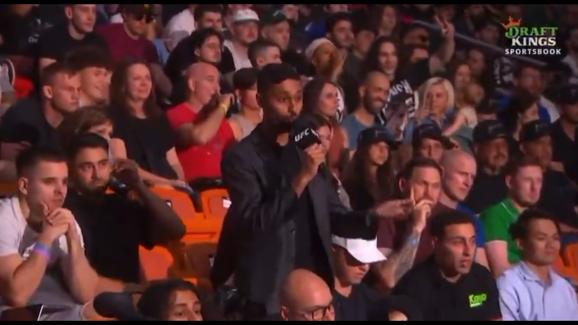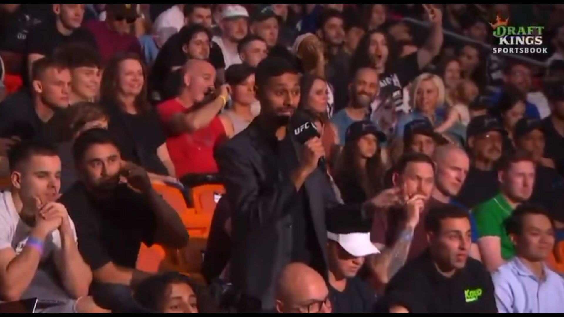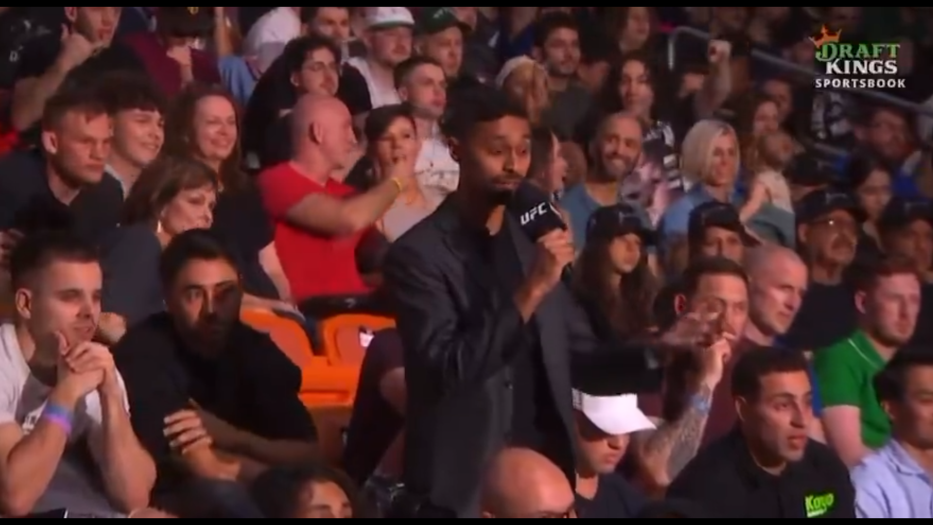 Protagoniști nu au fost însă starurile din UFC. Într-un moment în care pe scenă se aflau Alexander Volkanovski și Diego Lopes, luptătorii care vor asigura main-event-ul galei, într-o luptă pentru centura vacantă de la categoria featherweight, camerele de filmat au surprins un moment revoltător în public.