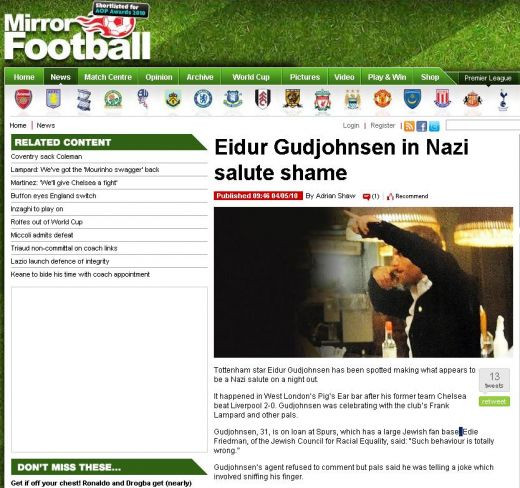 Anglia e scandalizata! "Gudjohnsen: joaca la echipa evreilor si a fost surprins facand un salut nazist!"