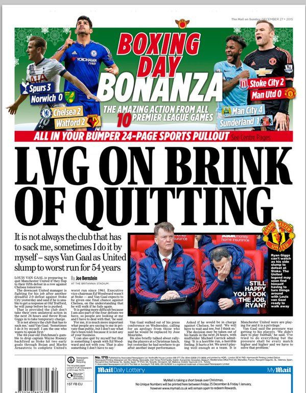 United a pierdut cu Stoke si a ajuns la a patra infrangere consecutiva. Olandezul a anuntat dupa meci ca e posibil sa plece singur si sa nu astepte concedierea din partea sefilor sai. Van Gaal nu are timp la dispozitie. United joaca maine cu Chelsea, derby-ul gigantilor decazuti din Premier League. Daca pierde si cu echipa lui Hiddink, despartirea dintre Manchester United si Van Gaal este sigura. Jose Mourinho e liber de contract si asteapta o sansa din partea fostei rivale.