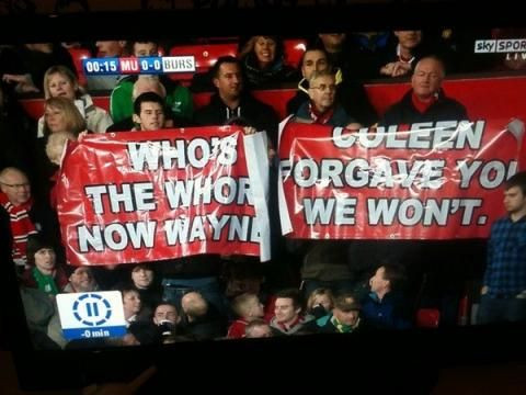 Fanii lui Manchester United au pornit razboiul impotriva lui Rooney: "Cine este tarfa acum, Wayne?", "Coleen poate ca te-a iertat, noi nu o vom face niciodata" - a fost mesajul fanilor pentru Rooney, care si-a anuntat intentia de a parasi Manchester United.