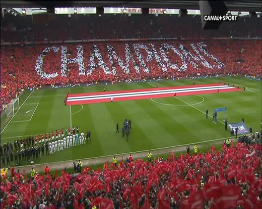 UPDATE: Coregrafie din 70.000 de stegulete pe Old Trafford. "CHAMPIONS" la tribuna a II-a, "20" la peluza din stanga, "13" la peluza din dreapta.