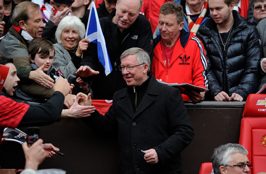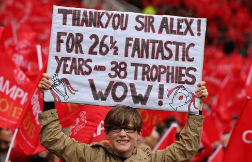 Si in tribune este sarbatoare. Sunt sute de bannere cu mesaje de multumire pentru omul care a castigat 38 de trofee cu Manchester United in ultimii 27 de ani.