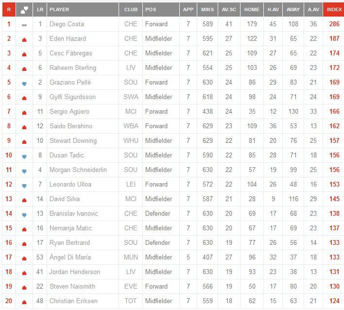 Thibaut Courtois, Chelsea (index 86) - Cesar Azpilicueta, Chelsea (116), Branislav Ivanovic, Chelsea (138), Gary Cahill, Chelsea (112), Ryan Bertrand, Southampton (128) - Eden Hazard, Chelsea (188), Cesc Fabregas, Chelsea (176), Gylfi Sigurdsson, Swansea City (168), Raheem Sterling (172) - Sergio Aguero, Man City (166), Diego Costa, Chelsea (287).