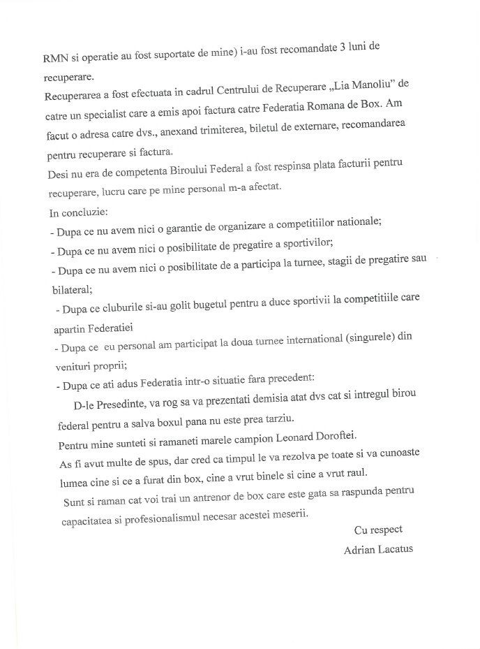"Dupa operatie (toate cheltuielile de RMN si operatie au fost suportate de mine) i-au fost recomandate 3 luni de recuperare. Recuperarea a fost efectuata in cadrul Centrului de Recuperare "Lia Manoliu" de catre un specialist care a emis apoi factura catre Federatia Romana de Box. Am facut o adresa catre dumneavoastra, anexand trimiterea, biletul de externare, recomandarea pentru recuperare si factura. Desi nu era de competenta Biroului Federal a fost respinsa plata facturii pentru recuperare, lucru care pe mine m-a afectat."