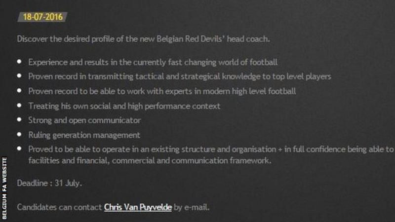 Federatia de la Bruxelles vrea un antrenor 'puternic si bun comunicator', care sa aiba o cariera la nivel inalt si sa fi dovedit ca poate transmite cunostinte tactice si de strategie 'unor jucatori de top'.