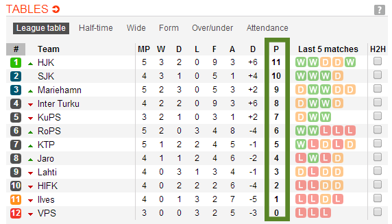 Acest lucru a fost posibil datorita faptului ca echipele au un numar inegal de meciuri, liderul HJK avand 5 meciuri jucate, la fel ca alte 3 echipe, in timp de ultima clasata, VPS are 0 puncte in 3 meciuri jucate, tot atatea avand si si KuPS, ocupanta locului 5.
