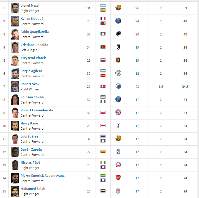 Leo Messi a inceput o noua saptamana la conducerea clasamentului pentru Gheata de Aur. Argentinianul Barcelonei a ajuns la 26 de goluri in actuala stagiune din La Liga si are doua reusite mai mult decat Mbappe, vedeta lui PSG. Podiumul este completat de italianul Fabio Quagliarella, primul fotbalist trecut de 36 de ani care ajunge la cota 20 in Serie A intr-un sezon.