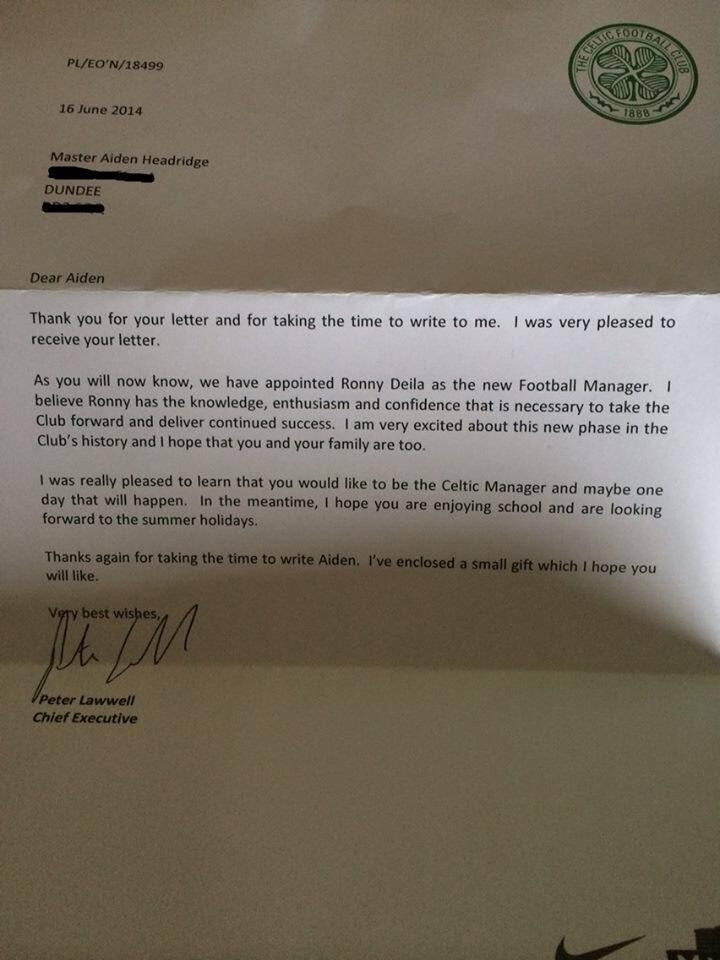Peter Lawwell, directorul executiv al clubului, i-a scris pustiului o scrisoare, explicandu-i faptul ca Ronny Deila a fost deja numit in functie, dar ca sansele sale sa devina manager sunt foarte mari daca se va tine de scoala. De asemenea, acesta i-a trimis si un echipament si un tricou cu Celtic.