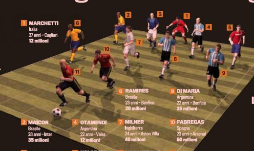 Italienii de la Gazzetta dello Sport au realizat cu 1 zi inainte de startul Campionatului Mondial echipa celor mai solicitati jucatori de pe piata transferurilor.