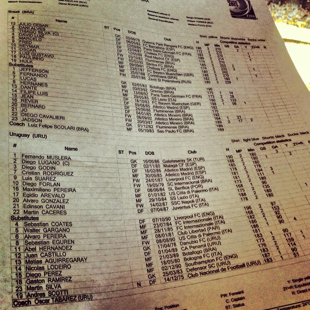Uruguay - 1 F. Muslera 2 D. Lugano 16 M. Pereira 22 M. Cáceres 3 D. Godín 7 C. Rodríguez 5 W. Gargano 17 E. Arévalo 9 L. Suárez 10 D. Forlán 21 E. Cavani