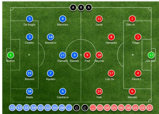 Júlio César; Dani Alves, Thiago Silva, David Luiz, Marcelo; Luiz Gustavo; Paulinho; Oscar; Hulk, Neymar, Fred