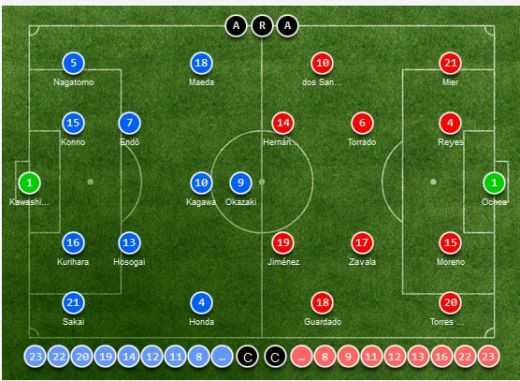 MEXIC: 12 J. Corona 2 F. Rodríguez 15 H. Moreno 22 G. Flores 11 J. Aquino 18 A. Guardado 6 G. Torrado 3 C. Salcido 17 J. Zavala 10 G. dos Santos 14 J. Hernández