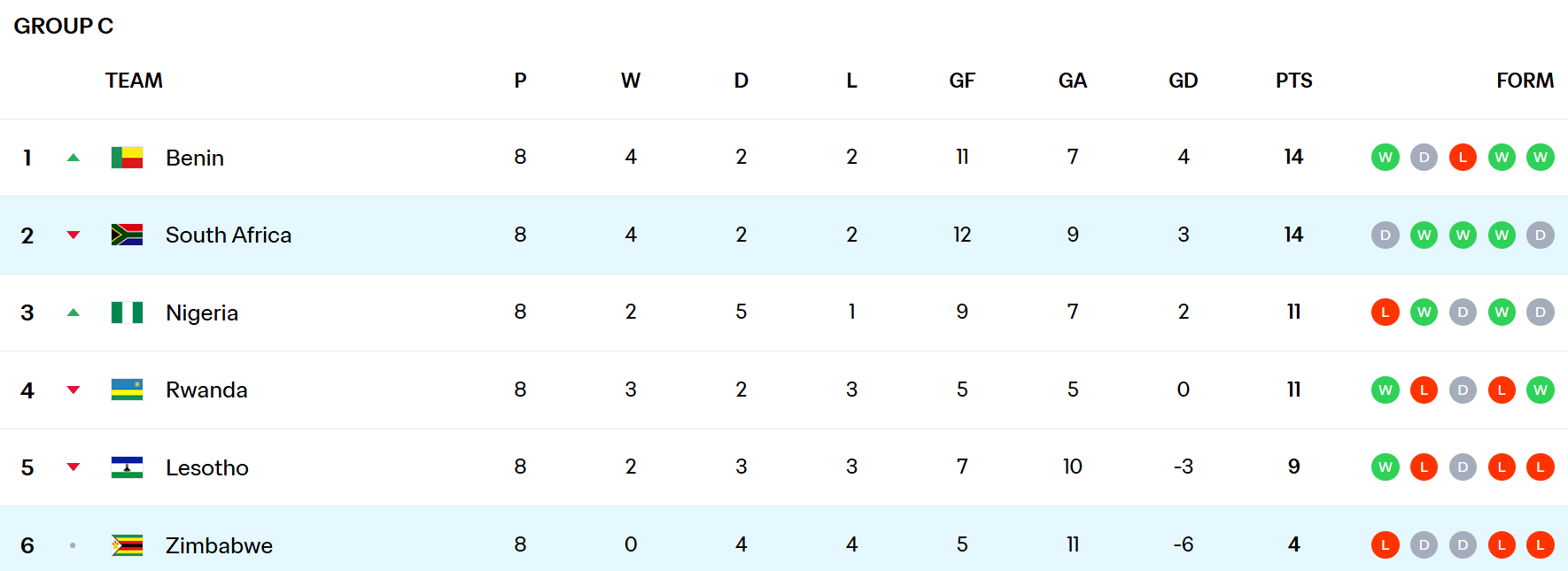 Cu două meciuri rămase de disputat în grupa C din preliminarii, Africa de Sud a coborât pe locul 2 din cauza meciului pierdut la masa verde, la egalitate cu liderul Benin, dar cu un golaveraj inferior.