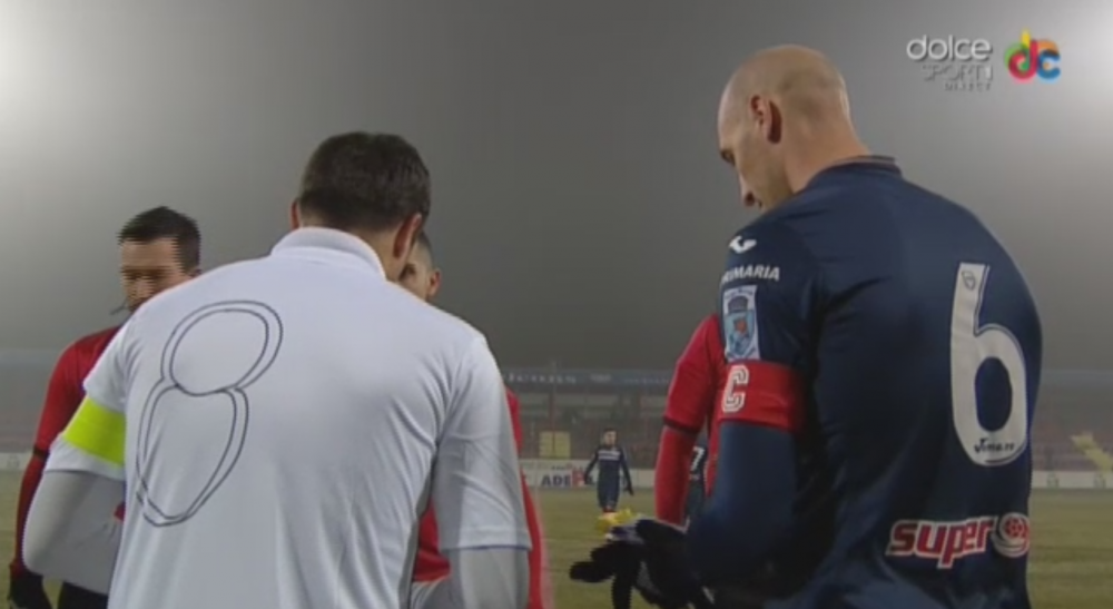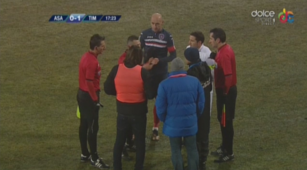 Min 17 - Arbitrul opreste pentru cateva zeci de secunde jocul. Fotbalistii ar vrea sa intrerupa partida. Mingote, portarul ASA-ului, i-a strigat centralului: "Daca ma accidentez, te dau in judecata".