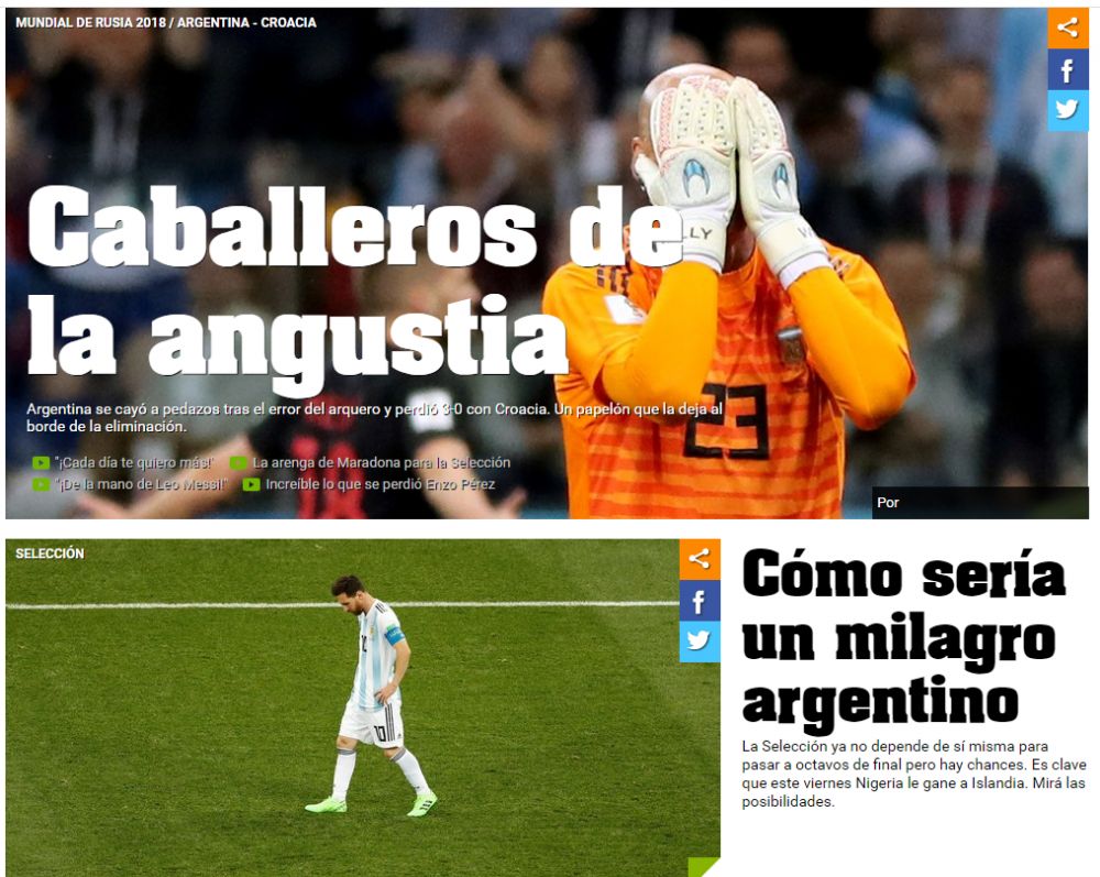 "CATASTROFA", "CAVALERII DURERII". Reactia presei argentiniene dupa naufragiul incredibil al lui Messi si Aguero in fata Croatiei