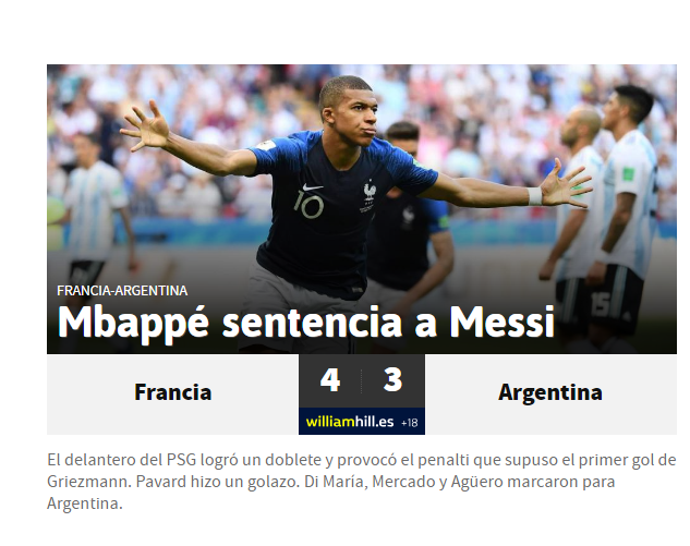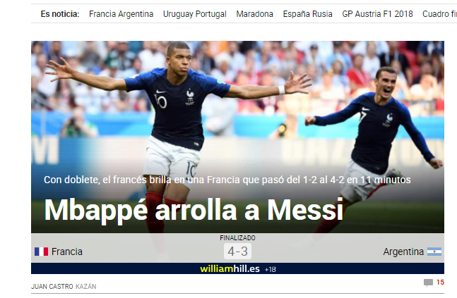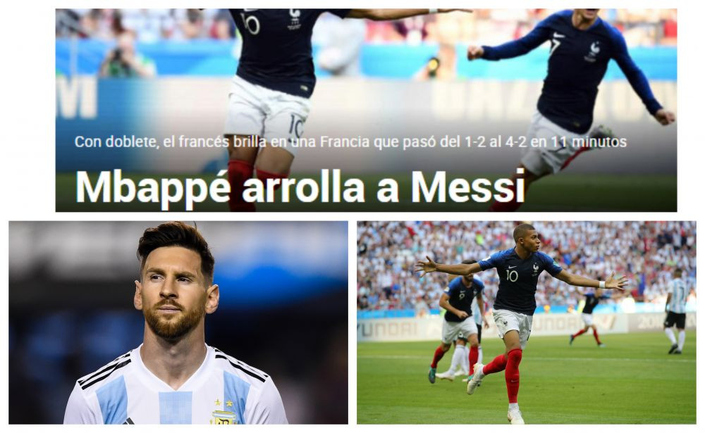 Presa spaniola se concentreaza asupra reusitei lui Mbappe si esecului lui Messi, care nu a reusit sa-si duca echipa in sferturi la Mondial. Marca titreaza: "Mbappe calca peste Messi", in timp ce AS noteaza: "Mbappe il condamna pe Messi"