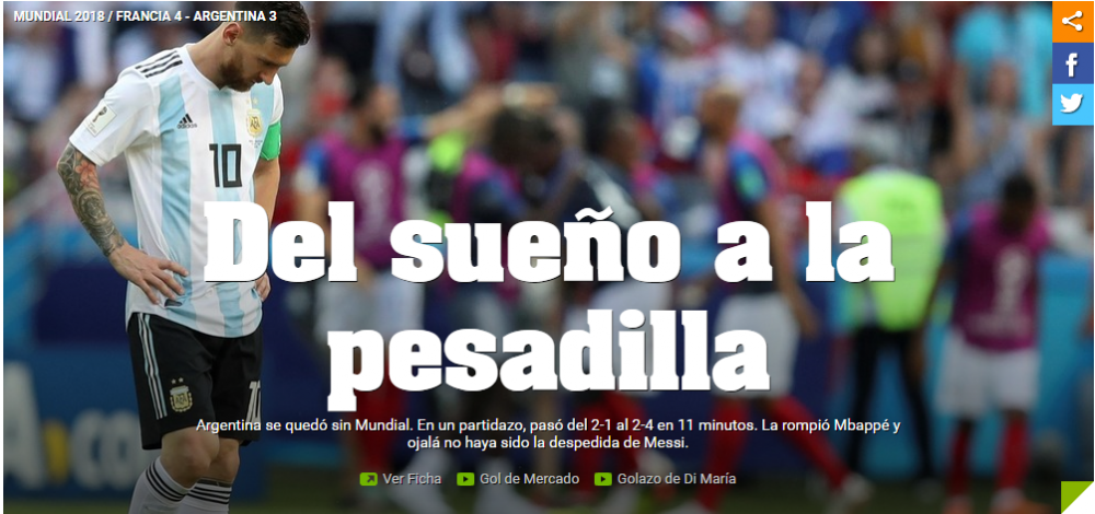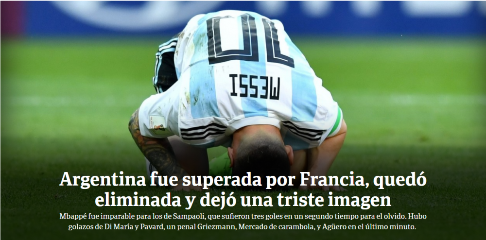 De partea cealalta, presa argentiniana scrie despre finalul visului frumos al nationalei lui Messi. Clarin titreaza: "Argentina a fost distrusa de Franta, este eliminata si lasa in urma o imagine trista", in timp ce Ole rezuma parcursul echipei nationale in Rusia: "De la vis la cosmar".