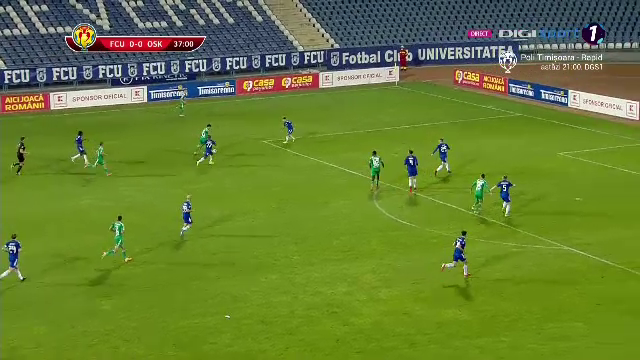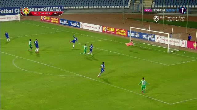 Min. 61: Ocazie Sepsi OSK! Gruparea din Sfântu Gheorghe are ocazia să își dubleze avantajul, dar Ashkovski îl ia la țintă pe portar din interiorul careului.