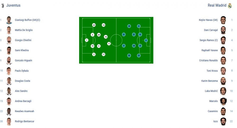 Navas - Carvajal, Ramos, Varane, Marcelo - Kroos, Modric, Casemiro - Isco, Cristiano Ronaldo, Benzema