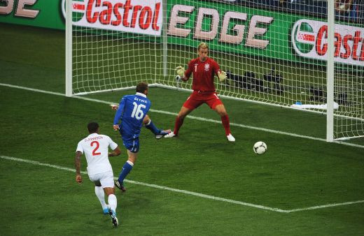 Min 24: OCAZIE URIASA pentru Italia! Balotelli primeste o pasa geniala de la Pirlo si scapa singur cu Hart insa este blocat in ultima clipa de Terry!