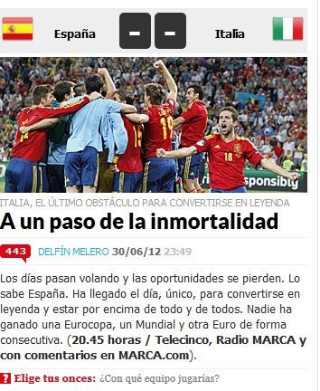 Or fi Italieni spartani diseara dar... Suprematia Spaniei e greu de infrant, Nemtii joaca mereu cel mai bine la turnee dar spanioli sunt mai reci 1-0 minim de putere consumat, nu joaca niciodata la spectacol, si asa au succes, probabil asta e noua tactica... mai bine castigi de 5 ori 1-0 decat sa umilesti anglia, argentina si celelalte echipe ca apoi sa pierzi 1-0... Asta e tactica.....