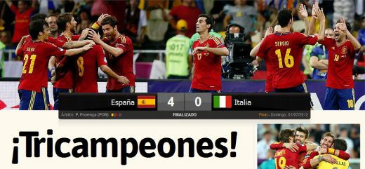 Reprezentativa Spaniei a câştigat Campionatul European pentru a doua oară consecutiv, după ce a învins selecţionata Italiei, scor 4-0 (2-0), duminică, în finala de pe stadionul Olimpic din Kiev.